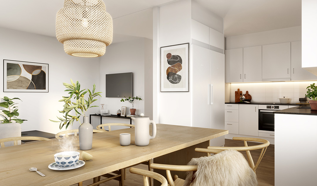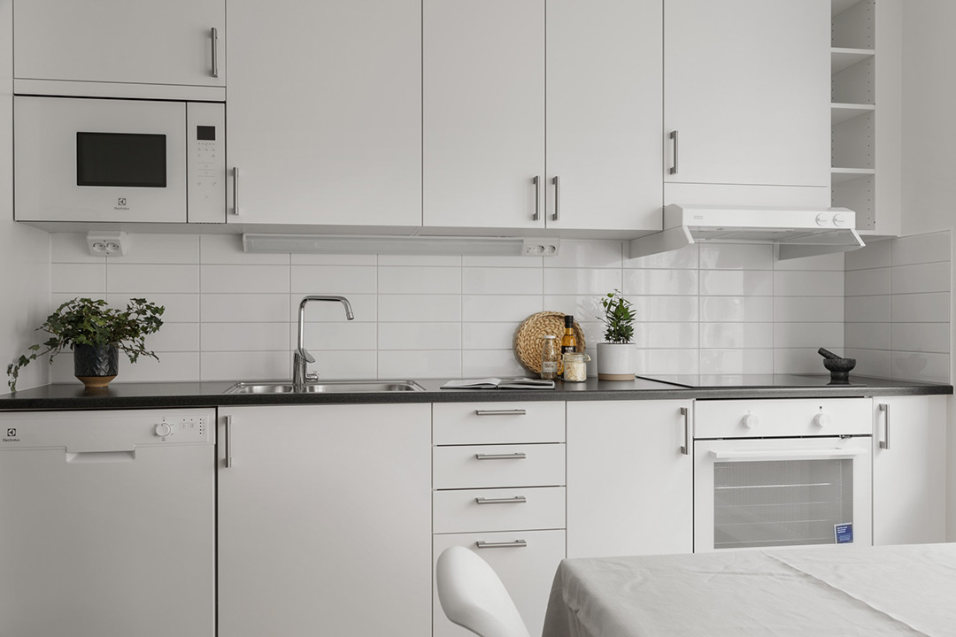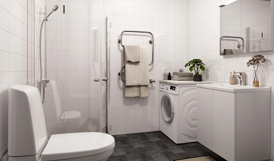 Uppskattade inredningsdetaljer och materialval finns det gott om. Fina ekparkettgolv och fönsterbänkar i stilren marmorimitation. Ljusa Marbodalkök med induktionshäll, inbyggnadsmikro och varmluftsugn. Även WC/dusch har inredning från Marbodal och här har vi lagt lite extra vikt vid funktion. Helkaklat med grått klinkergolv, kommod med spegelskåp, handdukstork med timer och duschhörna i klarglas. Tvättdel finns i samtliga lägenheter, kombimaskin alternativt tvättmaskin och torktumlare. Självklart med överliggande bänkskiva för att skapa en bra och praktiskt avlastningsyta.