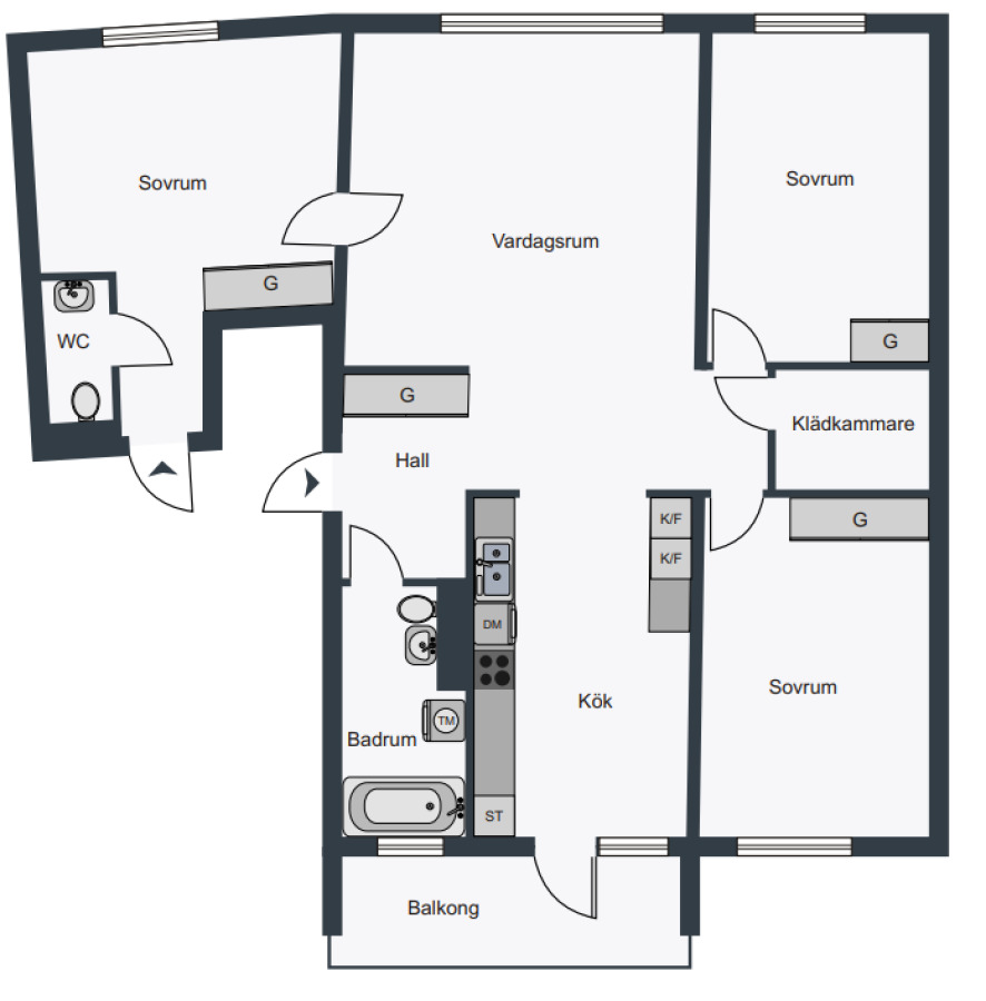 Den välplanerade bostaden erbjuder generösa ytor med tre sovrum, ett stort vardagsrum och ett stilrent kök med gott om förvaring och arbetsyta. Köket är fullt utrustat med diskmaskin, mikrovågsugn och dubbel kyl/frys – idealiskt för vardagens behov. Från köket nås även den soliga balkongen, perfekt för morgonkaffet eller avkoppling under varma dagar.
