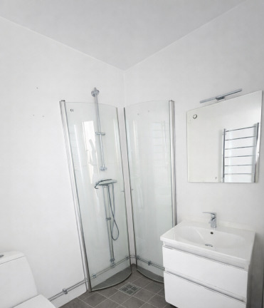 • Helkaklat badrum med vita väggar och grått golv. Badrummet är utrustat med duschväggar i glas, kommod med förvaring och spegel. Observera att ingen renovering av badrummet sker då detta är renoverat sedan tidigare.