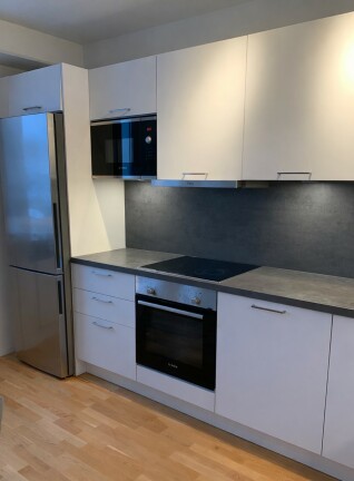 - Välplanerat kök vita luckor och en grå bänkskiva. Utrustningen består av fullstor kyl och frys, induktionshäll, mikro och diskmaskin.
