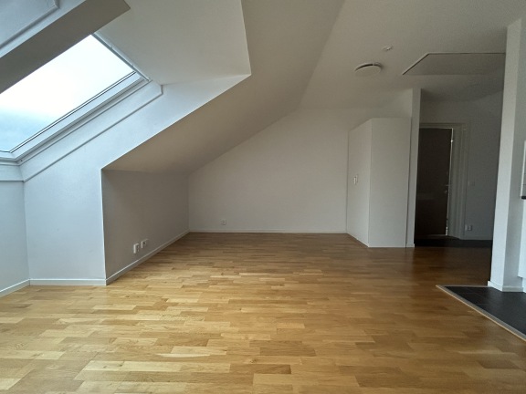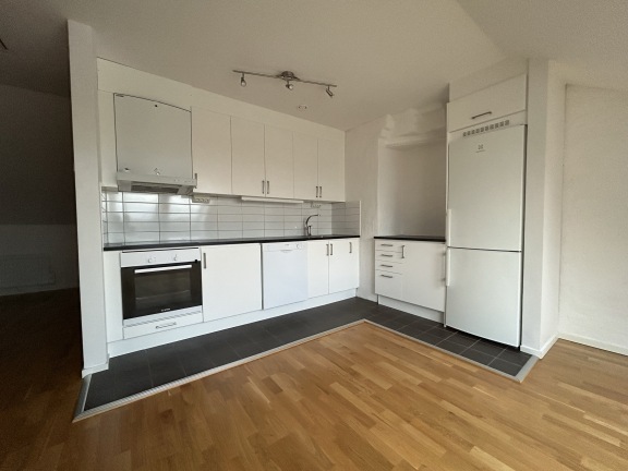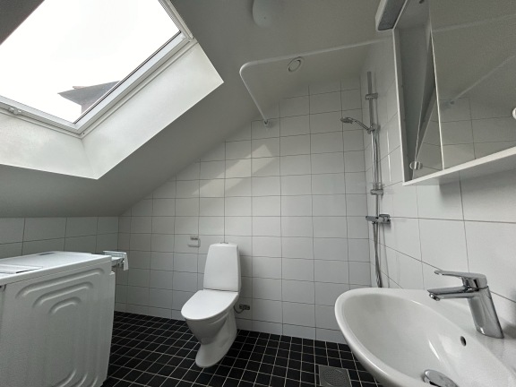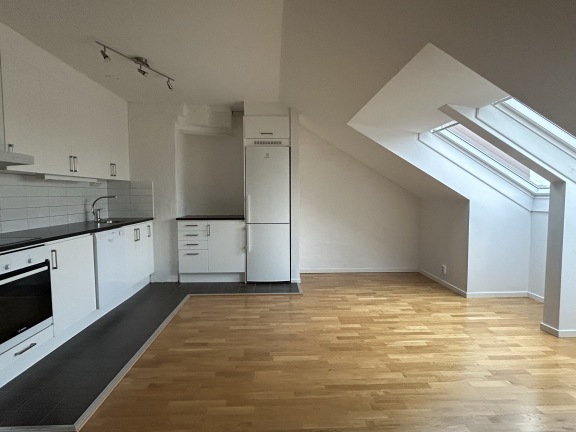 Lägenheten har en modern utformning med ljusa toner genomgående. Köket är stilrent med vita köksluckor och vitvaror samt utrustat med diskmaskin. Badrummet är helkaklat med klinkergolv och har dusch samt egen tvättmaskin. Snedtaket i kombination med fönstrens placering ger ett fint ljusinsläpp och skapar en mysig och personlig atmosfär.