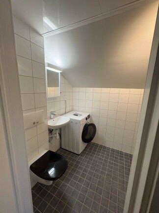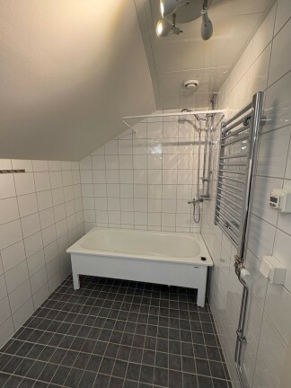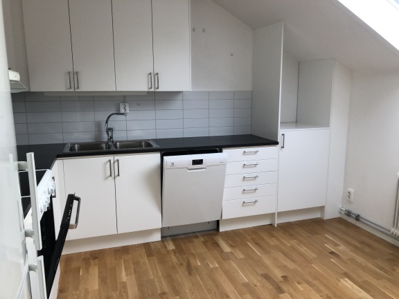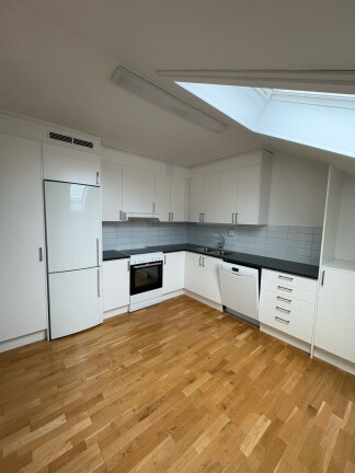 Lägenheten har ett modernt och ljust kök med diskmaskin och takfönster som skapar ett fantastiskt ljusinsläpp. Vardagsrummet rymmer både stor säng och en bekväm soffgrupp, vilket gör bostaden lätt att möblera efter dina behov. Genomgående ljusa färger och parkettgolv ger ett fräscht och tidlöst intryck.