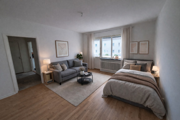 Lägenheten består av ett rum där vardagsrum och sovdel samsas i en öppen och lättmöblerad planlösning. Här finns utgång till en egen balkong som ger extra ljus och en naturlig plats för avkoppling under årets varmare månader.