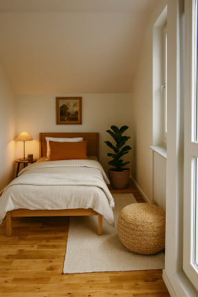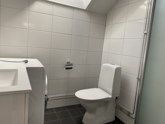 Det kaklade badrummet är fräscht och har både dusch och tvättmaskin, samt ett takfönster som skapar en luftig och ljus känsla. Sovrummet är lite mindre men mysigt, med plats för säng och förvaring.