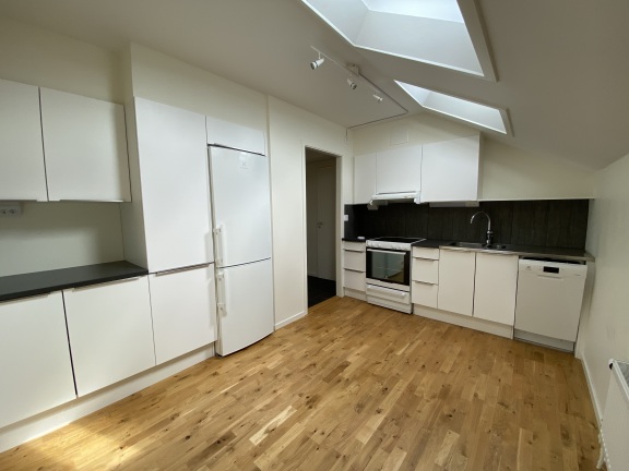 Lägenheten har ett ljust vardagsrum med vacker ekparkett och utgång till en solig balkong där du kan njuta av morgonkaffet. Det vita köket är modernt och utrustat med diskmaskin, har dessutom takfönster som ger ett härligt ljusinsläpp under dagens alla timmar.