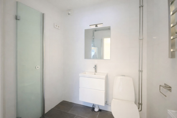 Lägenheten erbjuder ett fräscht badrum med kakel och klinker, duschväggar samt egen tvättmaskin och torktumlare, vilket ger extra vardagskomfort. Köket är funktionellt och utrustat med diskmaskin. Vardagsrummet är ljust och inbjudande med utgång till balkong, perfekt för avkoppling under större delen av året. Planlösningen är smart och gör bostaden lättmöblerad med en hemtrevlig känsla.