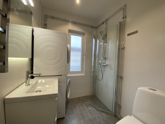 • Helkaklat badrum utrustat med tvättmaskin, torktumlare och dusch