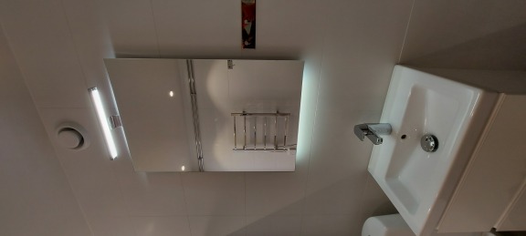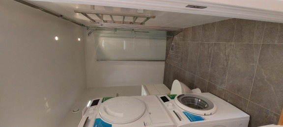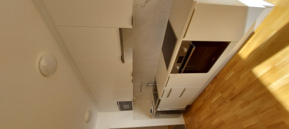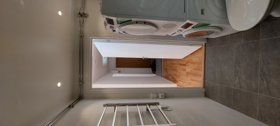 Köket är modernt och fullt utrustat med diskmaskin, induktionshäll och inbyggd mikrovågsugn, vilket gör vardagen både smidig och funktionell. En välplanerad bostad där komfort och design går hand i hand.