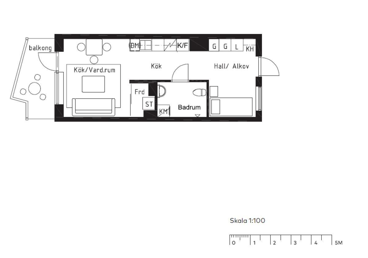 Lägenheten har genomgående ekparkett, ljusa väggar och en öppen planlösning mellan kök och vardagsrum som ger en luftig känsla. Köket är fullt utrustat med spishäll, ugn, kyl/frys och spiskåpa.