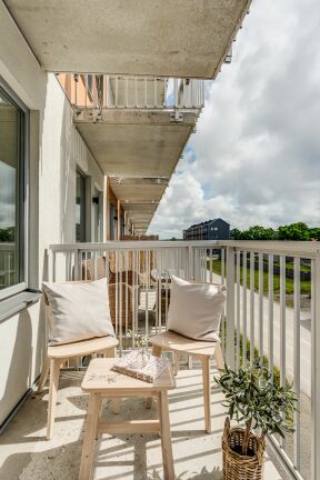 Som en extra fördel har lägenheten balkong högst upp i huset, en perfekt plats att njuta av lugna morgnar eller kvällar med utsikt över området.