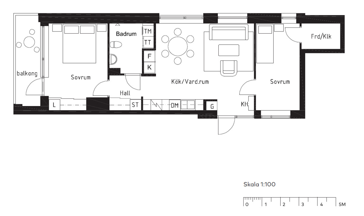 Bostaden erbjuder en genomtänkt planlösning med öppen och social yta mellan kök och vardagsrum. Stora fönster ger ett fantastiskt ljusinsläpp och skapar en ljus och inbjudande atmosfär. Genomgående ekparkett och ljusa väggar bidrar till en modern och hemtrevlig känsla.