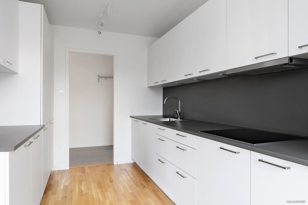 Här får du ett smart planerat hem med kokvrå, ett rymligt badrum med kombinerad tvätt- och torkmaskin.