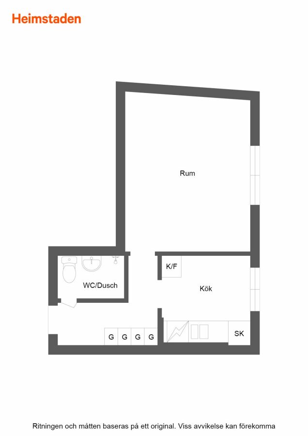 Lägenheten har ett ljust vardagsrum med parkettgolv och en välkomnande hall med samma fina ytskikt. Köket har en äldre men välbevarad inredning med plastmatta på golvet – funktionellt och med gott om förvaringsmöjligheter. Badrummet är utrustat med plastmatta på både golv och väggar, vilket gör det lätt att hålla rent och fräscht.