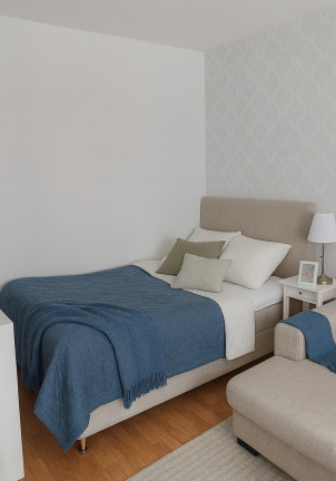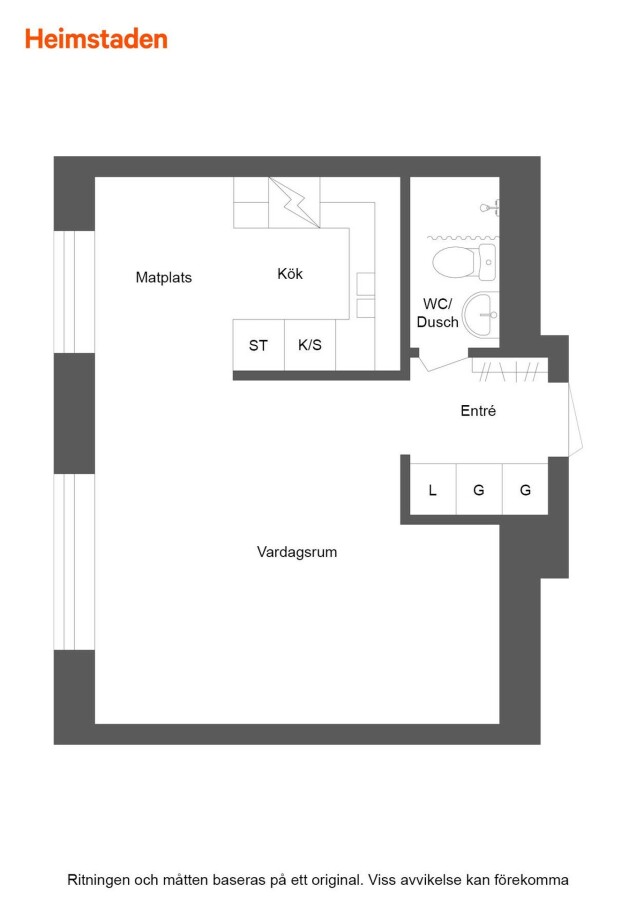 Denna välplanerade enrummare erbjuder en rumsindelning där sovalkoven skapar en avskild sovplats. Köket rymmer ett mindre matbord och erbjuder goda arbetsytor. Badrummet är äldre men funktionellt och utrustat med dusch. Möblering på bilderna är endast för inspiration och visar på möjligheterna med planlösningen.