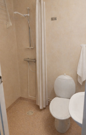 Köket är praktiskt planerat och har plats för ett mindre köksbord .Badrummet har äldre standard och är utrustat med våtrumsmatta.