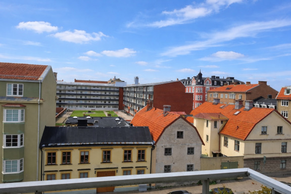 Balkongen har en bra storlek och vetter ut mot Bredgatan, vilket ger en trivsam plats för avkoppling.