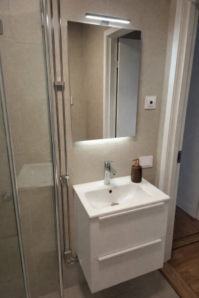 Redan i hallen möts du av praktiskt klinkergolv som övergår i genomgående ekparkett i bostadens övriga rum, vilket skapar ett enhetligt och varmt intryck. Köket är fullt utrustat med diskmaskin och mikro samt vita köksluckor. Vitvaror i rostfritt. Badrummet är nyrenoverat i snyggt sandfärgat kakel och utrustat med kommod samt dusch med duschdörrar.