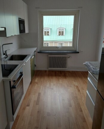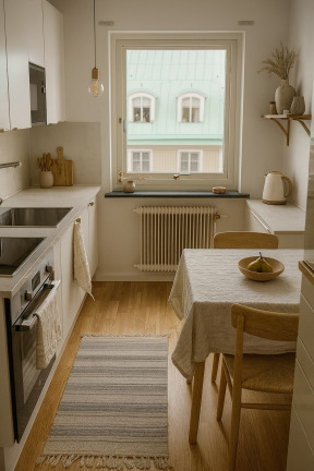 - Genomgående parkettgolv och ljusa väggar som ger ett fräscht intryck
