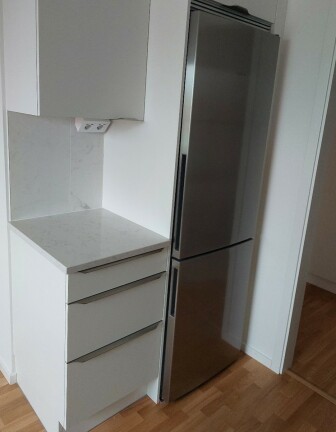 - Kök med vita luckor, diskmaskin och mikro samt plats för mindre matbord, se bild för inspiration hur man kan möblera