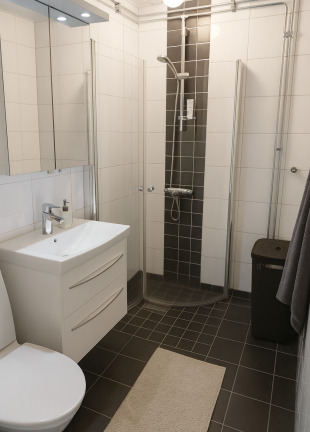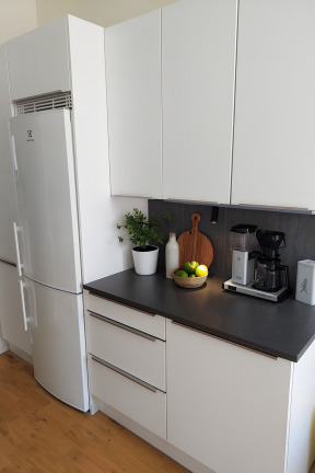 Lägenheten har klinkers i entrén och genomgående ekparkett i alla rum samt vita väggar som förstärker ljuset. Det fräscha köket är utrustat med vita luckor och diskmaskin för extra bekvämlighet. Badrummet är helkaklat med klinkergolv, duschdörrar och kommod. Sovrummet har bra storlek och gott om förvaring med fyra garderober. Säkerhetsklassad dörr ger ökad trygghet. Möbleringen på bilderna är för att ge inspiration och tips.