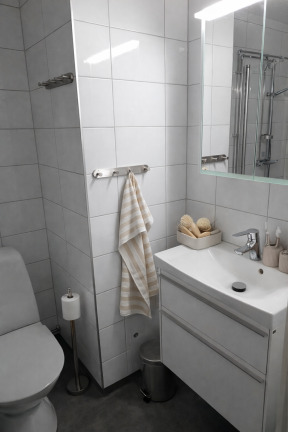 Badrummet är fräscht och förberett med framdraget el och vatten för tvättmaskin. I anslutning till hallen finns en praktisk klädkammare som ger goda förvaringsmöjligheter.