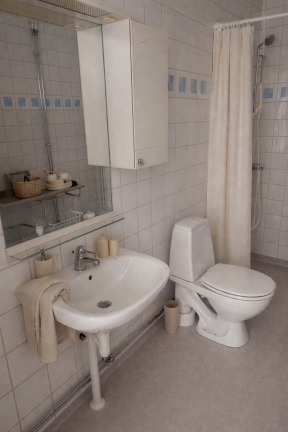 Bostaden erbjuder en genomtänkt planlösning med parkettgolv i samtliga rum utom köket samt ljusa, vita väggar som skapar en neutral och lättmöblerad bas. Det något äldre badrummet är utrustat med egen tvättpelare, och det finns ingen gemensam tvättstuga i fastigheten .