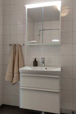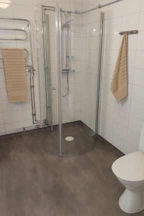 • Fräscht badrum med tvättpelare och dusch, renoverat 2024