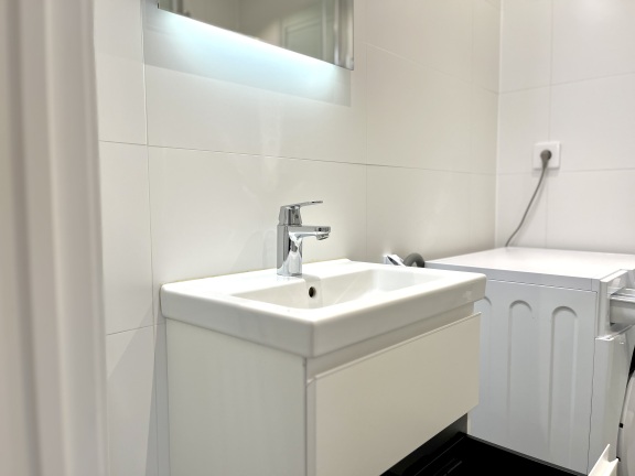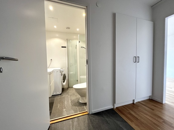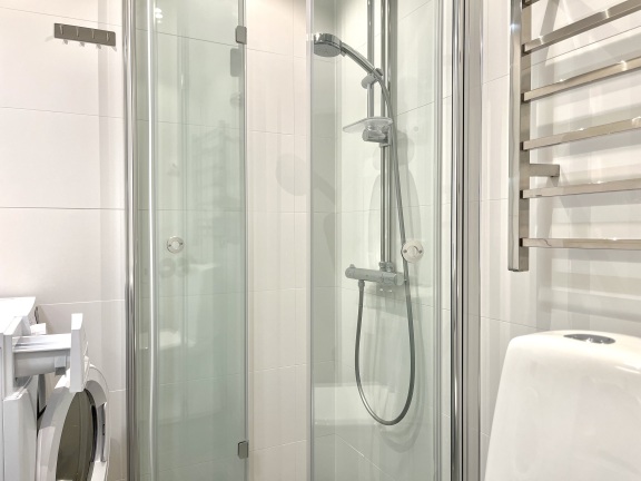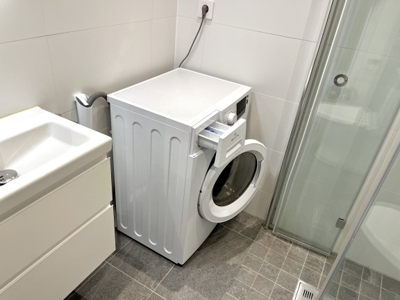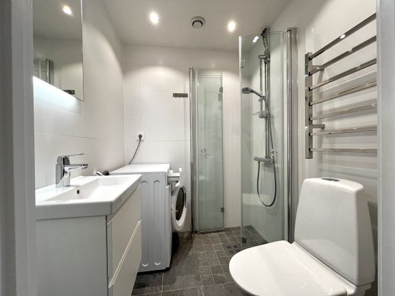 Badrummet är utrustat med golvvärme, infällda spotlights i taket, dubbelbelyst spegel, tvättställskommod med eluttag, handdukstork, vikbara duschdörrar i glas. Väggar är kaklade med stora ljusa plattor och golvet utgörs av stenklinker. Tvättmaskin med integrerad torktumlare ingår!
