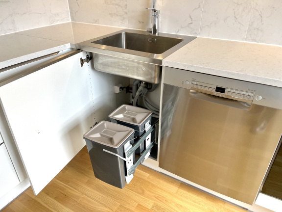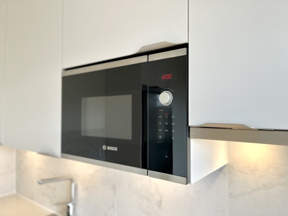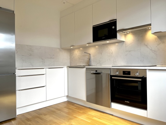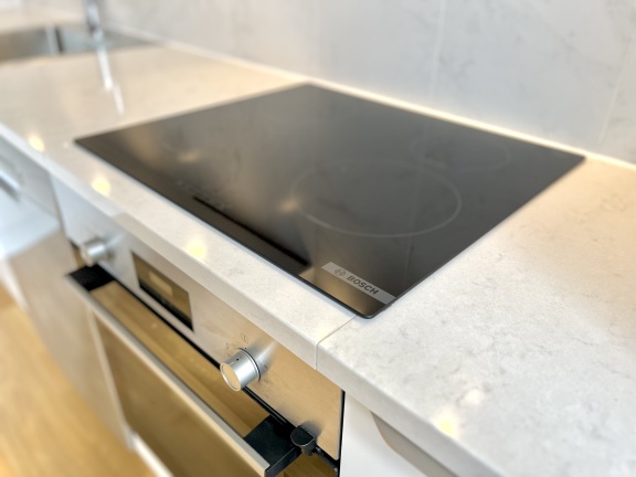 Kök från HTH med mjukstängande vita luckor och infällda spotlights under överskåpen. Vitvarorna från Bosch är i rostfritt utförande. Induktionshäll, varmluftsugn, diskmaskin och inbyggnadsmikro förhöjer standarden! Slitstarka bänkskivor av stenkomposit och stänkskydd i sten.