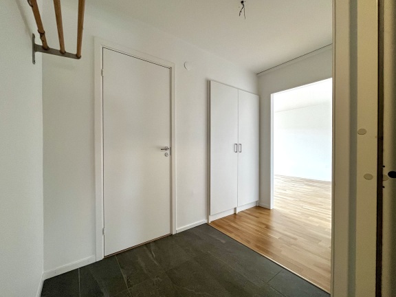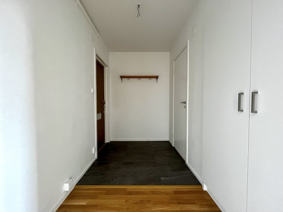 Vitmålade väggar och parkett i hall, rum och kök.