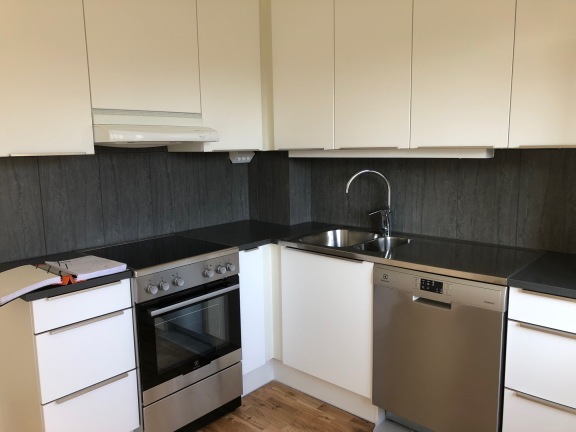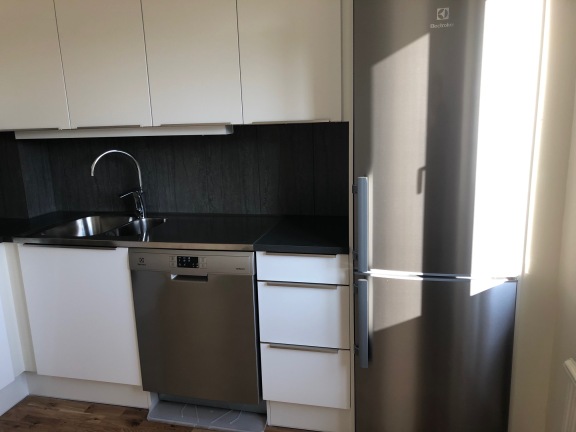 En välplanerad lägenhet med balkong. Ljust kök med vita högblanka luckor och vitvaror i stilrent rostfritt. Hällspis med varmluftsugn. Badrummet har kakel på väggarna, klinkergolv med värmeslingor, duschhörn i glas, kommodtvättställ, handukstork. Samtliga väggar är målade vita och ekparkett finns i alla torra utrymmen.