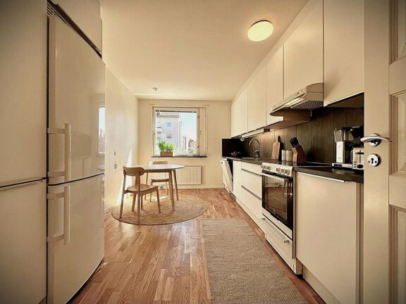 Lägenheten erbjuder en smart planlösning med en praktisk hall som har gott om förvaring i flera garderober. Det stilrena köket är modernt utformat med vita skåpluckor, klinkergolv och utrustat med diskmaskin samt hällspis med varmluftsugn. Här finns även en rymlig matplats som bjuder in till både vardagsmiddagar och sociala tillfällen.