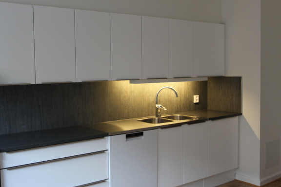 Lägenheten genomgick en renovering 2019. Köket har vitt kakel och diskmaskin, hällspis och varmluftugn.