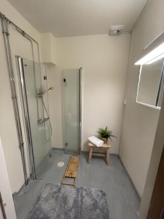 Badrummet är utrustat med dusch och tvättmaskin, och bostaden erbjuder dessutom en praktisk klädkammare som ger gott om förvaringsmöjligheter.