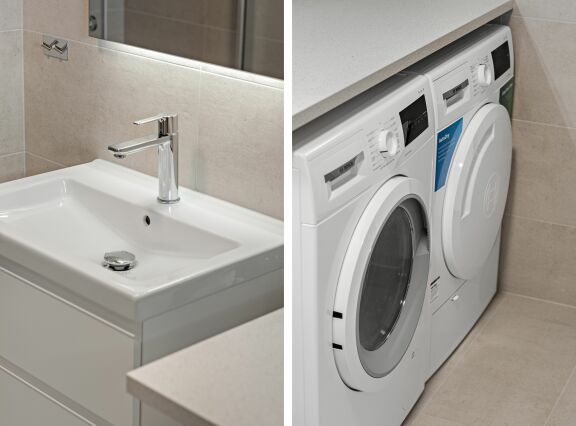 Badrummet utrustas med golvvärme, infällda spotlights i taket, dubbelbelyst spegel, tvättställskommod med eluttag, handdukstork, vikbara duschdörrar i glas. Väggar och golv kaklas med stora plattor i en mjuk nyans. Tvättmaskin med integrerad torktumlare kommer att ingå!