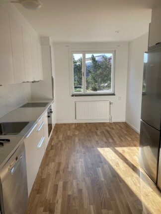 Lägenheten har ett nytt vitt kök med vitvaror i rostfritt stål: hällspis, varmluftsugn, inbyggd mikrovågsugn samt diskmaskin.