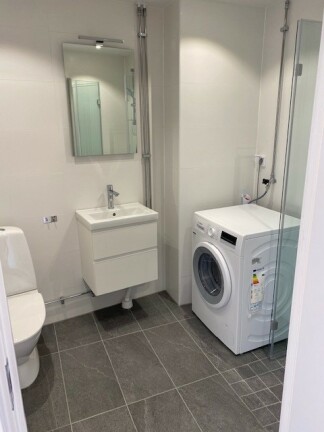 Badrummet är helkaklat med klinkergolv och golvvärme samt utrustat med kommodtvättställ, duschhörna i glas, handdukstork och tvättmaskin.
