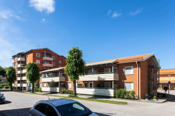 Radhusliknande fastighet med egen ingång från markplan, postlåda och farstukvist. Trappa finns upp till lägenheten. Vån 2 av 2. Stor trivsam balkong med förmiddagssol.