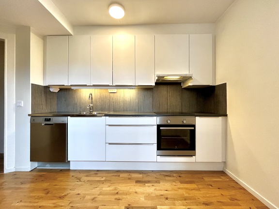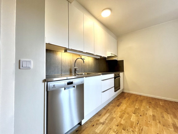 Köket är modernt utrustat med hel kyl och hel frys, diskmaskin, infälld induktionshäll och inbyggd varmluftsugn.