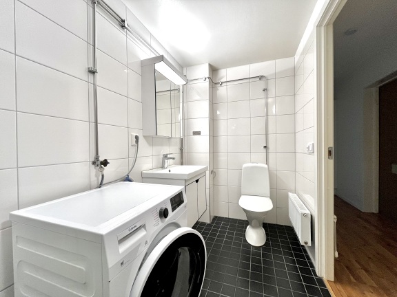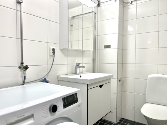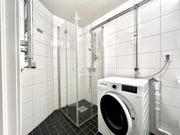 Badrummet är helkaklat med golvvärme och är även utrustat med spegelskåp med eluttag, tvättställsommod, elektrisk handdukstork och en tvättmaskin med integrerad torktumlare. Duschen har smidiga vikbara glasdörrar.