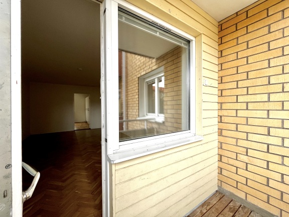 Från vardagsrummet når du en härlig balkong med trätrall i hörnet av fastigheten med trätrall