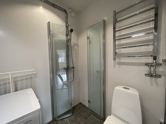 Renoverat badrum med golvvärme, klinker, kakel, handdukstork, duschväggar i glas och förberett för egen tvättmaskin.