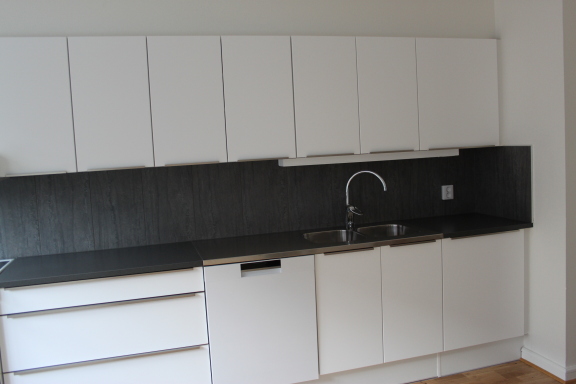 Köket är stilrent i vitt och utrustat med allt du behöver: diskmaskin, hel kyl och hel frys samt hällspis med varmluftsugn. Från köket nås även bostadens balkong. Vardagsrummet har dessutom en fransk balkong. Bostaden erbjuder två badrum - ett med dusch och ett med badkar - båda med kaklade väggar och klinkergolv med behagliga värmeslingor. Tvättmaskin och torktumlare ingår och gör vardagen extra bekväm