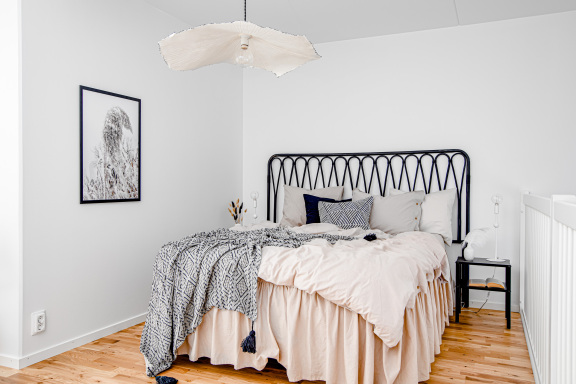 Genom hela bostaden löper ekparkett och vitmålade väggar, vilket ger ett modernt och ljust intryck som passar de flesta inredningsstilar.