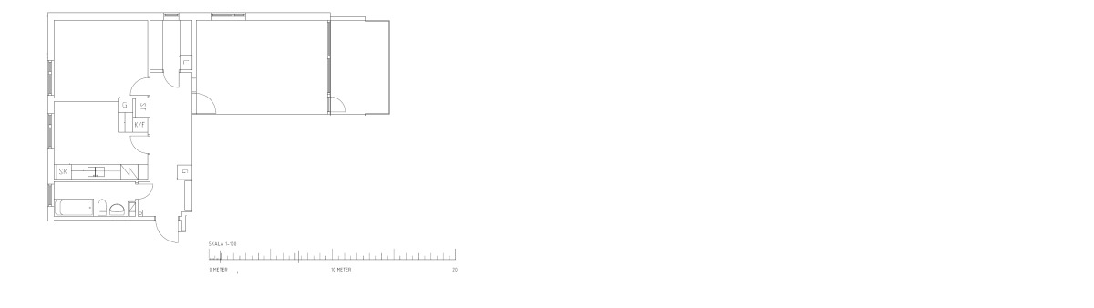 - Kök med grå plastmatta, sandfärgade luckor och vitt kakel ovanför svarta bänkskivor. Utrustat med diskmaskin samt delad kyl och frys. Här finns även plats för matbord.