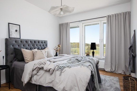 Från ett av sovrummen når du bostadens balkong där du kan njuta av lugna stunder i solen, och i vardagsrummet finns även en fransk balkong som bidrar till ett fint ljusinsläpp.