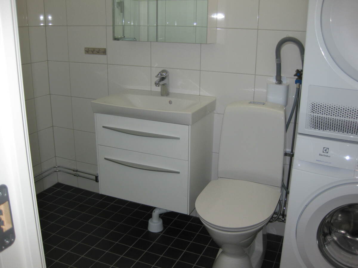- Det helkaklade duschrummet går i modern grå ton och är utrustat med både torktumlare och tvättmaskin.