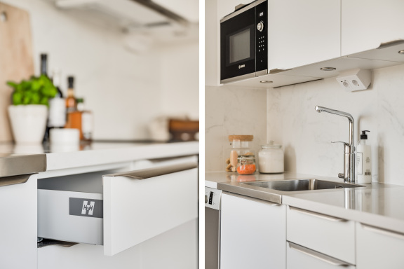 Köket är ett modernt vitt HTH-kök med stilrent marmorerat stänkskydd och tåliga bänkskivor i kvartskomposit. Köket är fullt utrustat med rostfria vitvaror, induktionshäll, varmluftsugn, mikro och gott om förvaring – perfekt för både vardagsmatlagning och middagar med vänner.