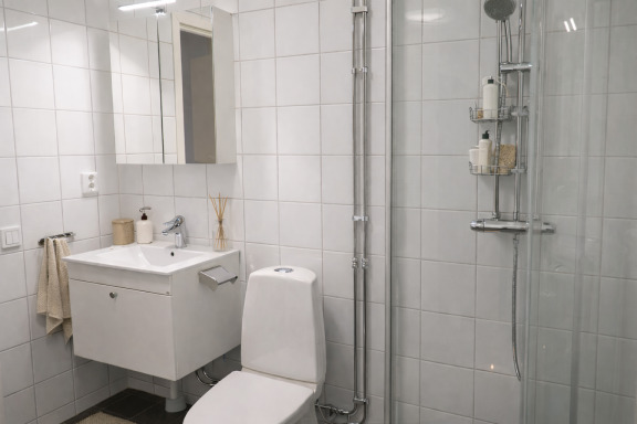 • Kaklat badrum med duschväggar, tvättmaskin och torktumlare