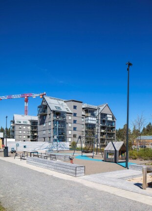 Här i naturnära Kronandalen erbjuder vi 80 hyresrätter med genomtänkta planlösningar och hög kvalitet på inredning och material. Här skapas en trevlig boendemiljö med gemensam samlingslokal och värmande bastu.